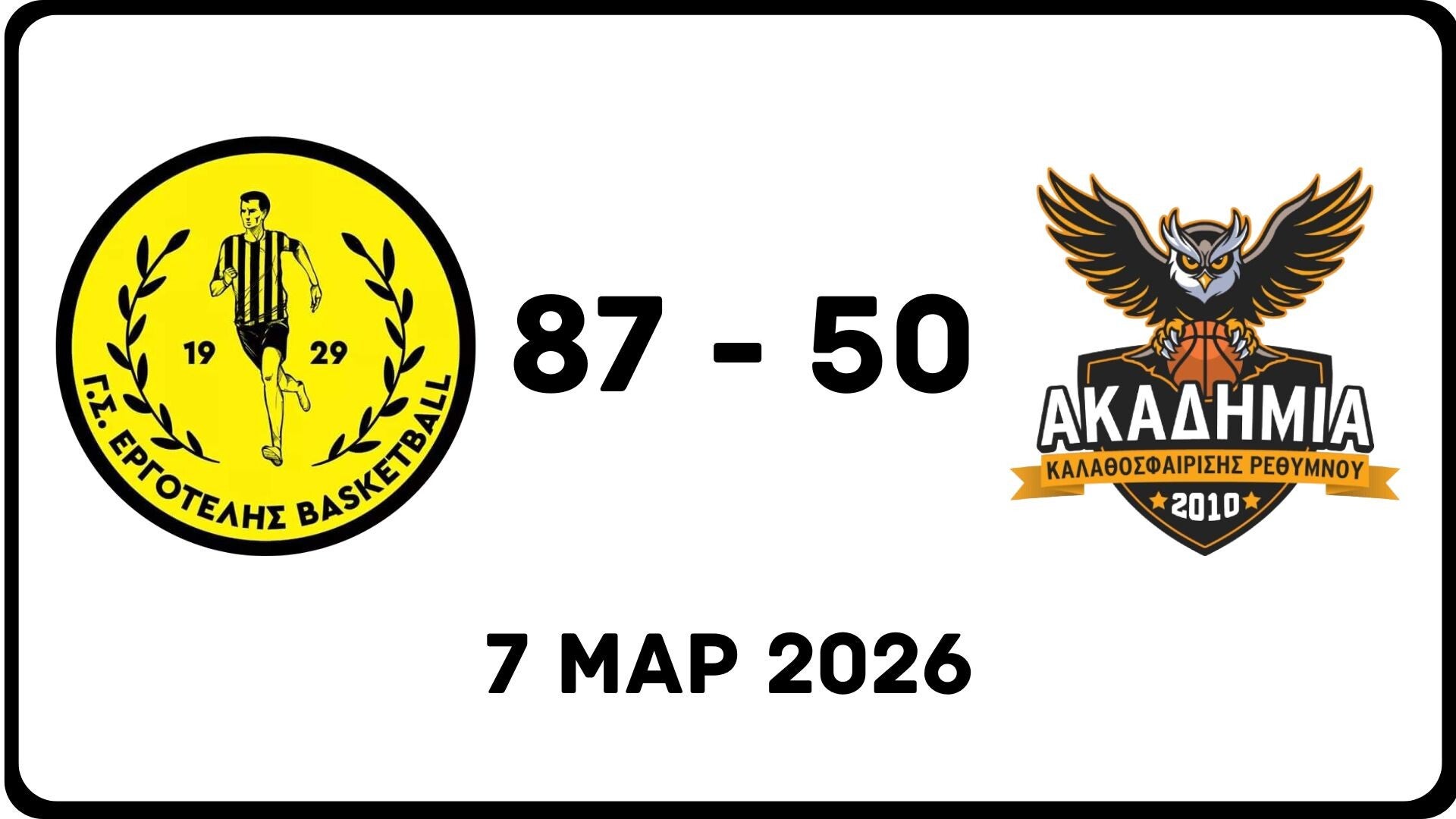 Την ήττα γνώρισε το Ανδρικό τμήμα της Ακαδημίας BC στην εκτός έδρας αναμέτρηση με τον Εργοτέλη στο Ηράκλειο, με τελικό σκορ 87–50.