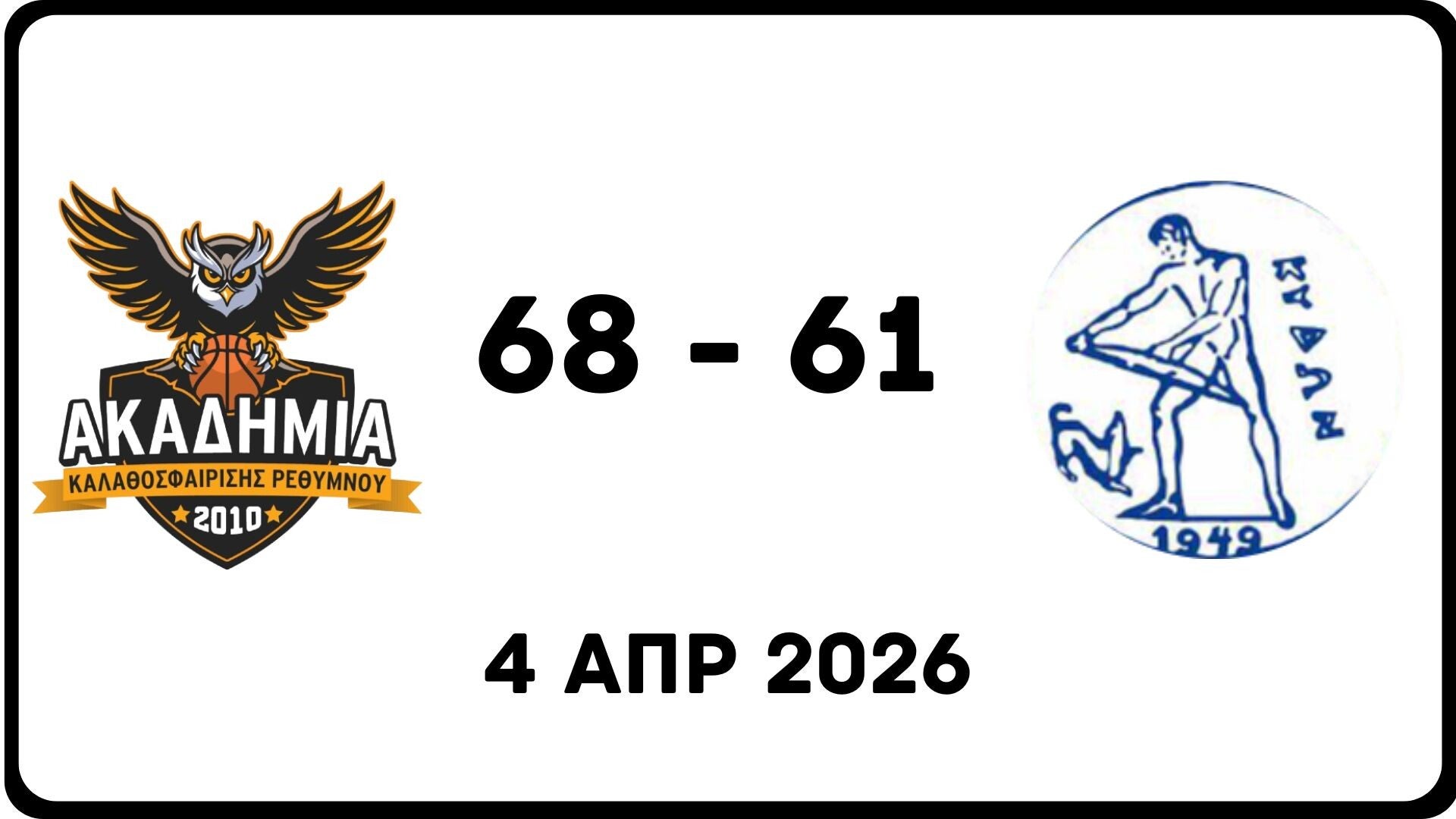 Με τον καλύτερο τρόπο ολοκλήρωσε τις φετινές της υποχρεώσεις η Ακαδημία BC, επικρατώντας του Κύδωνα Χανίων με σκορ 68–61, στο τελευταίο παιχνίδι της σεζόν.